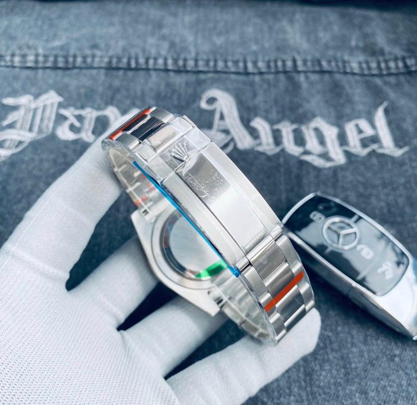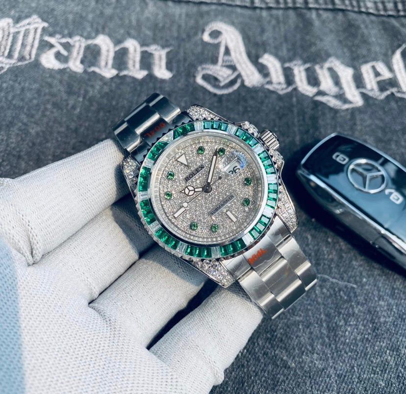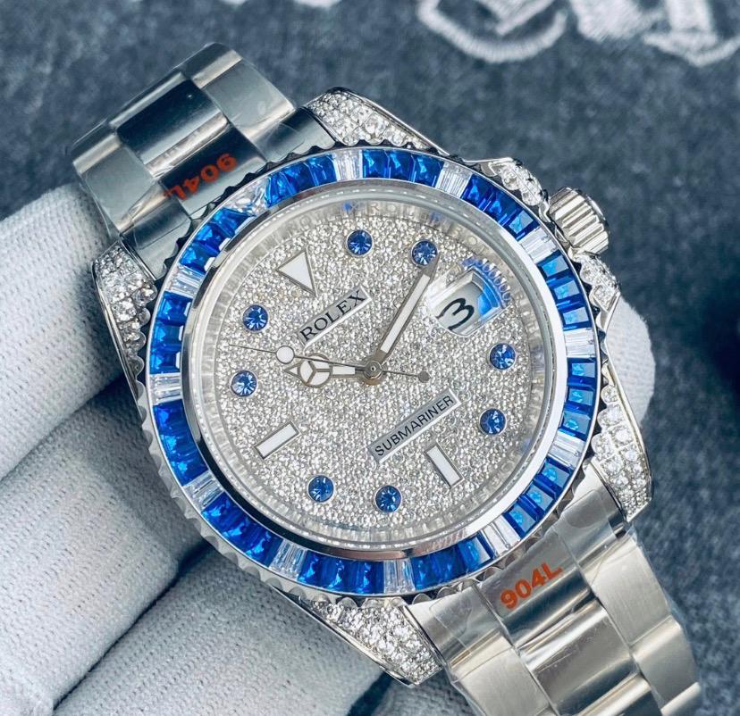 Reloj Rolx color plata, con toques brillantes, con correa de acero inoxidable.
