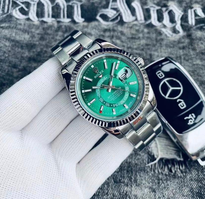 Reloj Rolx color plata, con correa de acero inoxidable.